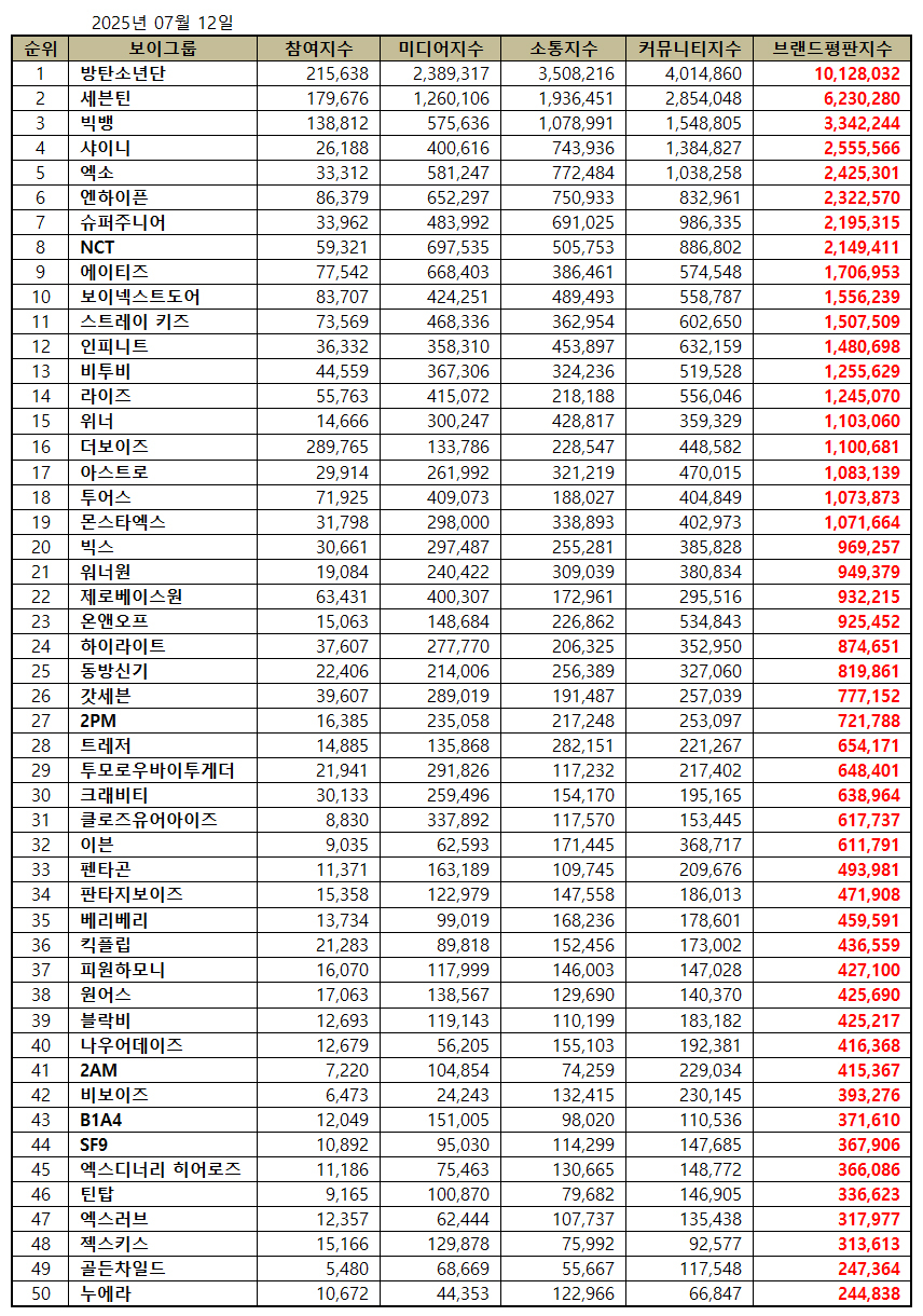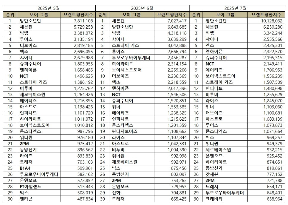 2025년 7월 보이그룹 브랜드평판 30위 순위는 방탄소년단, 세븐틴, 빅뱅, 샤이니, 엑소, 엔하이픈, 슈퍼주니어, NCT, 에이티즈, 보이넥스트도어, 스트레이 키즈, 인피니트, 비투비, 라이즈, 위너, 더보이즈, 아스트로, 투어스, 몬스타엑스, 빅스, 워너원, 제로베이스원, 온앤오프, 하이라이트, 동방신기, 갓세븐, 2PM, 트레저, 투모로우바이투게더, 크래비티 순으로 분석됐다.