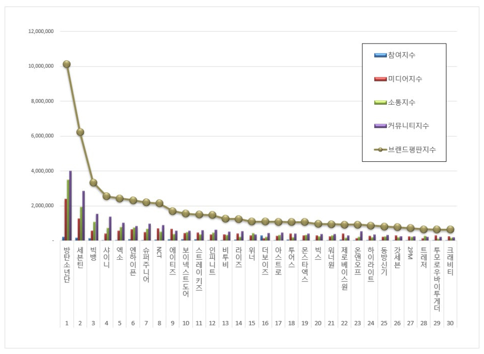 보이그룹 브랜드평판 1위를 기록한 방탄소년단 ( RM, 진, 슈가, 제이홉, 지민, 뷔, 정국 ) 브랜드는 참여지수 215,638 미디어지수 2,389,317 소통지수 3,508,216 커뮤니티지수 4,014,860이 되면서 브랜드평판지수 10,128,032로 분석됐다. 지난 6월 브랜드평판지수 6,843,685와 비교해보면 47.99% 상승했다.