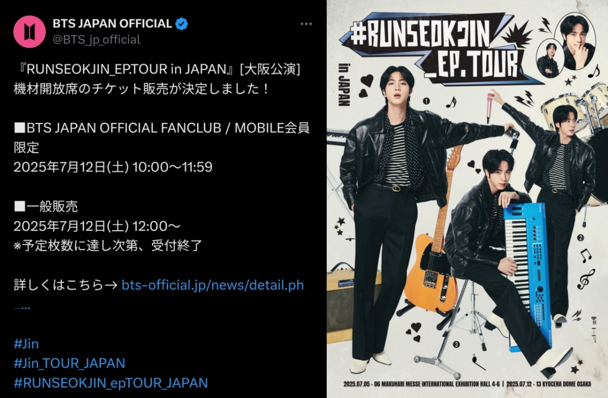 지난 6월 28일 한국을 시작으로 8월 10일까지 첫 번째 단독 콘서트이자 첫 번째 단독 월드투어(#RUNSEOKJIN_EP.TOUR) 중인 진은 지난 12일 일본 오사카 교세라 돔에서 최상단 층은 물론, 시야제한석까지 모두 가득 채운 관객들 앞에서 최고의 라이브를 선보이며 전 세계 팬들의 열광을 한 몸에 받았다.