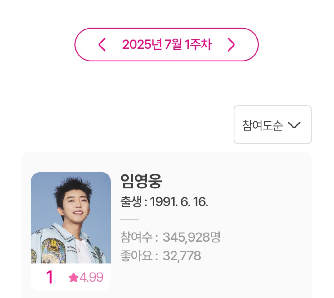 임영웅은 7월 7일부터 7월 13일까지 집계된 7월 1주차 아이돌차트 평점랭킹에서 34만 5928표를 얻어 1위를 차지했다.