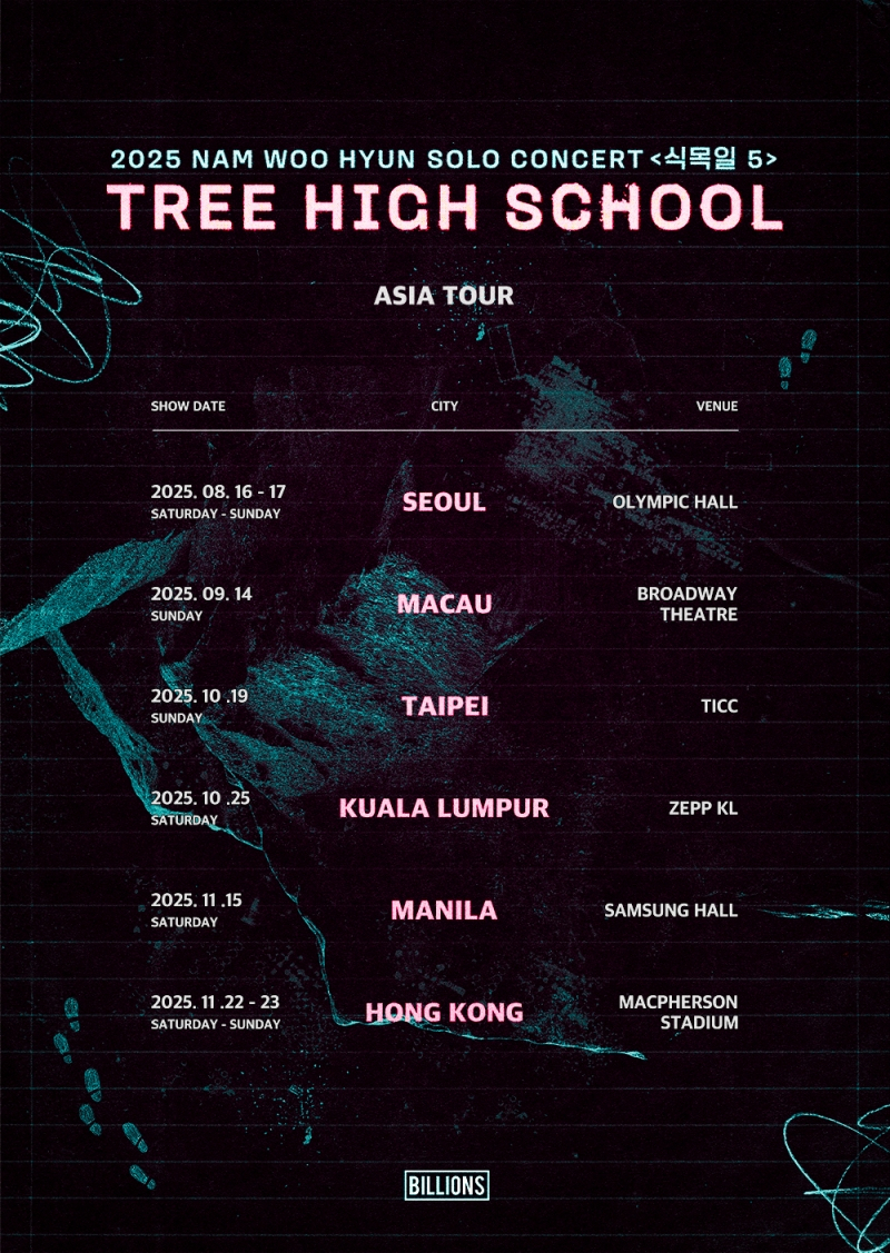 소속사 빌리언스는 15일 공식 SNS를 통해 '2025 남우현 솔로 콘서트 '식목일5 - 나무고(高) :트리 하이스쿨'(2024 NAM WOO HYUN SOLO CONCERT '식목일5 - 나무고(高) :TREE HIGH SCHOOL')'(이하 '식목일5') 아시아 투어 포스터를 공개했다.