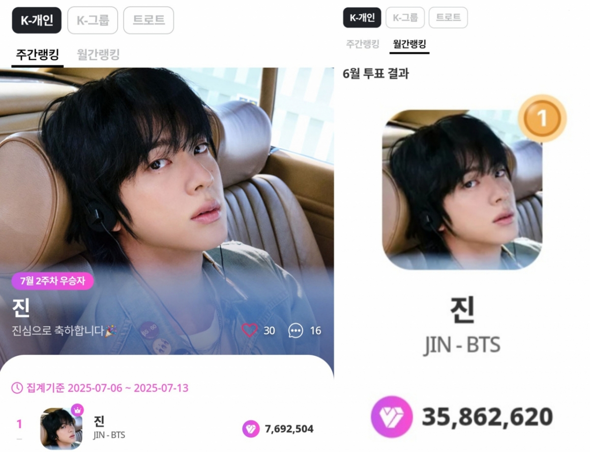 진은 마이원픽 'K-POP 개인 부문 주간랭킹' 7월 2주차(7월 6일~7월 13일) 투표에서 769만 2504개의 하트를 얻어 1위에 올랐다.