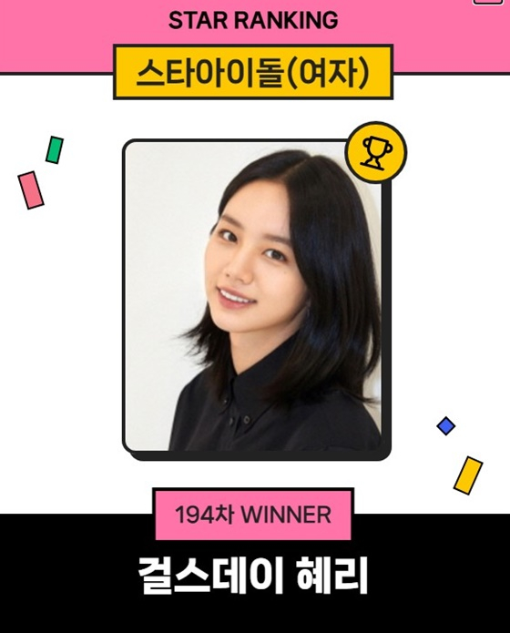 혜리는 지난 10일 오후 3시 1분부터 17일 오후 3시까지 진행된 7월 2주(194차) 스타랭킹 스타아이돌 여자 부문 랭킹 투표에서 2만 1263표를 획득하며 1위에 올랐다.