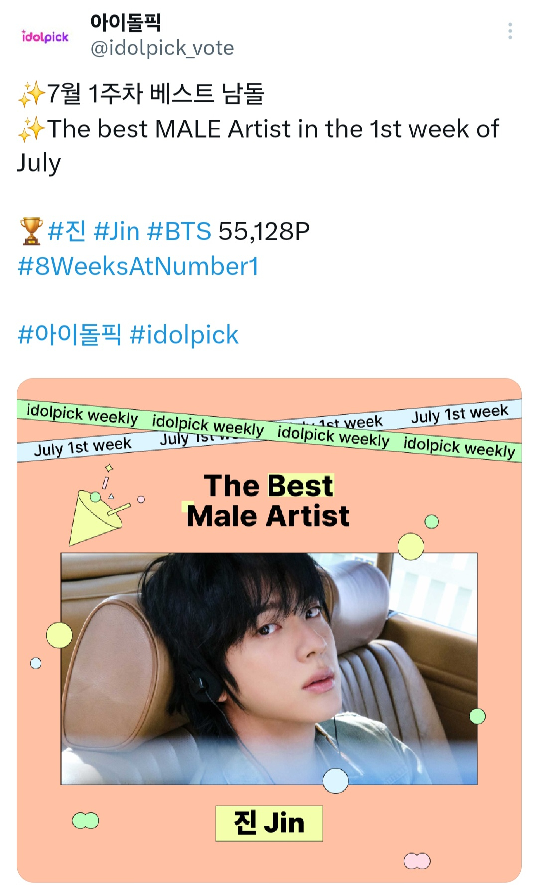 방탄소년단(BTS) 진이 아이돌픽(idolpick) 위클리 투표에서 8주 연속 1위를 달성하며 인기를 빛냈다.
