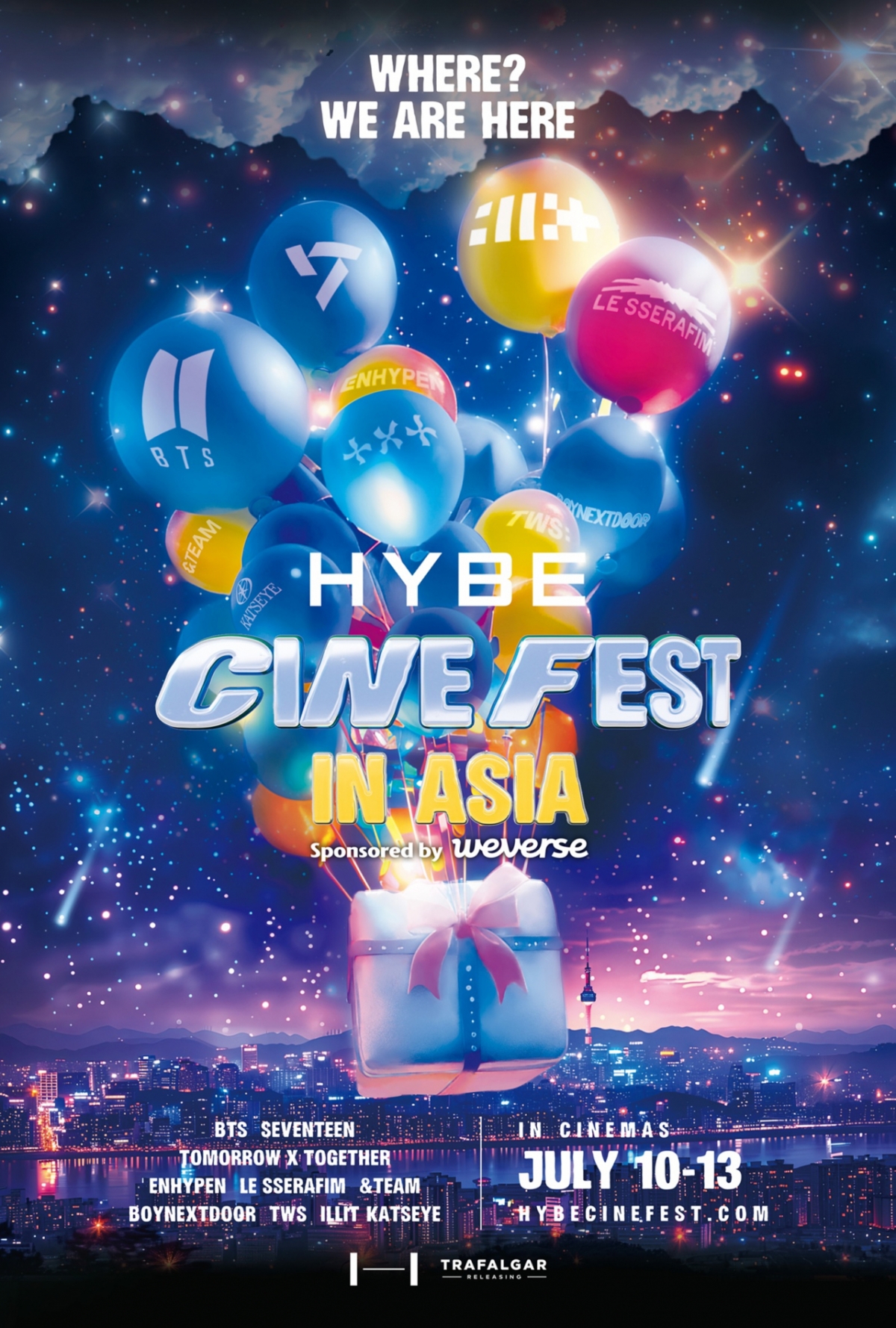하이브는 글로벌 배급사 '트라팔가 릴리징(Trafalgar Releasing)'과 함께 지난 10~13일 한국, 대만, 말레이시아, 싱가포르, 인도, 인도네시아, 일본, 태국, 필리핀, 홍콩 등 아시아 10개 국가 및 지역 370여개 극장에서 '하이브 씨네 페스트 인 아시아(HYBE CINE FEST IN ASIA sponsored by Weverse)'를 성황리에 진행했다고 17일 밝혔다.
