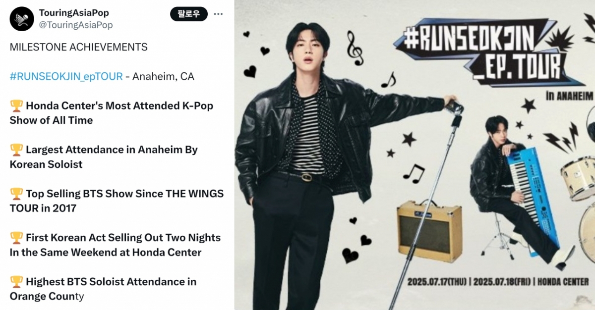 지난 6월 28일부터 8월 10일까지 첫 번째 단독 팬 콘서트이자 첫 번째 단독 월드투어(#RUNSEOKJIN_EP.TOUR) 중인 진은 지난 17일(현지 시간, 한국 시간 18일) 미국 애너하임 혼다 센터(Honda Cente)에서 최고의 열광 속 첫 미국 콘서트를 가졌다.