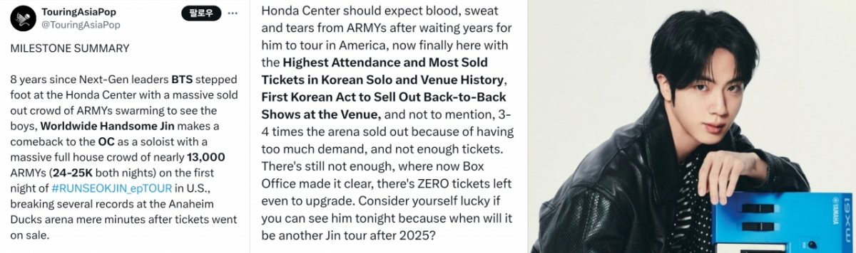 TouringAsiaPop는 또 차세대 리더 방탄소년단이 엄청난 매진 관중으로 가득 찬 혼다 센터에 발을 들여놓은 지 8년 만에, 월드와이드 핸섬 진이 솔로 가수로 컴백했다며 완전 매진으로 미국에서 첫날 밤 1만 3천명에 달하는 팬들이 가득 찼다고 전했다. 티켓이 판매된 지 몇 분 만에 여러 기록을 경신했다는 사실 또한 밝혔다.