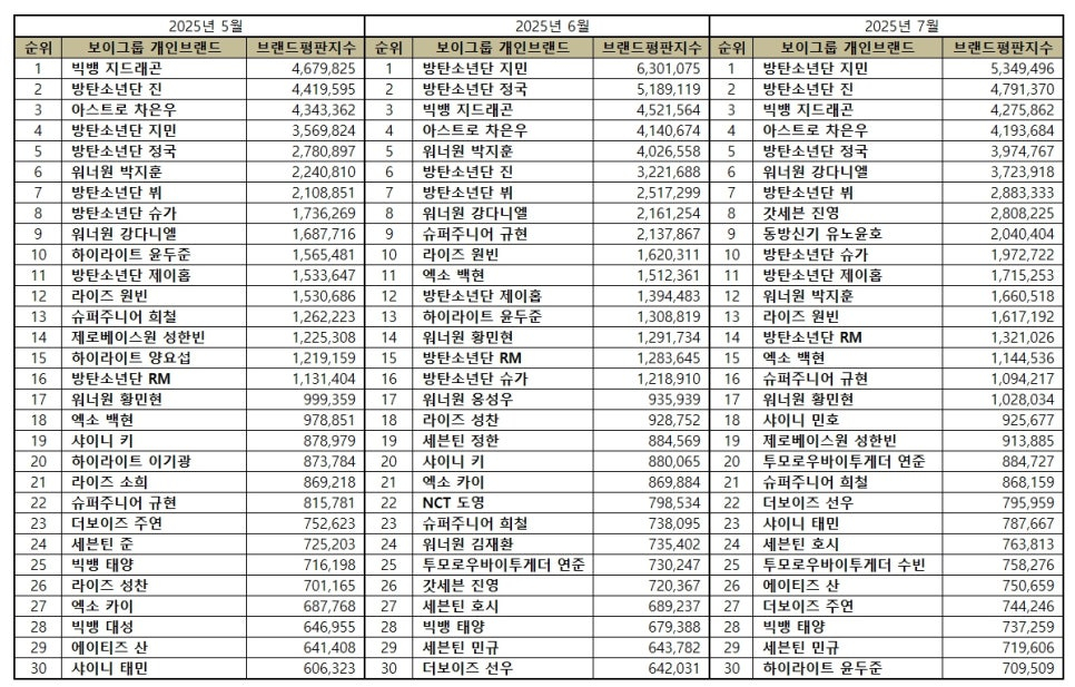 2025년 7월 보이그룹 개인 브랜드평판 30위 순위는 방탄소년단 지민, 방탄소년단 진, 빅뱅 지드래곤, 아스트로 차은우, 방탄소년단 정국, 워너원 강다니엘, 방탄소년단 뷔, 갓세븐 진영, 동방신기 유노윤호, 방탄소년단 슈가, 방탄소년단 제이홉, 워너원 박지훈, 라이즈 원빈, 방탄소년단 RM, 엑소 백현, 슈퍼주니어 규현, 워너원 황민현, 샤이니 민호, 제로베이스원 성한빈, 투모로우바이투게더 연준, 슈퍼주니어 희철, 더보이즈 선우, 샤이니 태민, 세븐틴 호시, 투모로우바이투게더 수빈, 에이티즈 산, 더보이즈 주연, 빅뱅 태양, 세븐틴 민규, 하이라이트 윤두준 순으로 분석됐다.