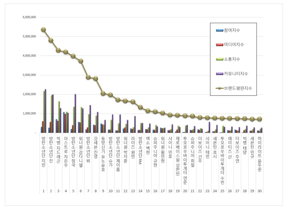 보이그룹 개인 브랜드평판 1위를 기록한 방탄소년단 지민 브랜드는 참여지수 313,578 미디어지수 605,621 소통지수 2,167,611 커뮤니티지수 2,262,685가 되면서 브랜드평판지수 5,349,496으로 분석됐다. 지난 6월 브랜드평판지수 6,301,075와 비교해보면 15.10% 하락했다.