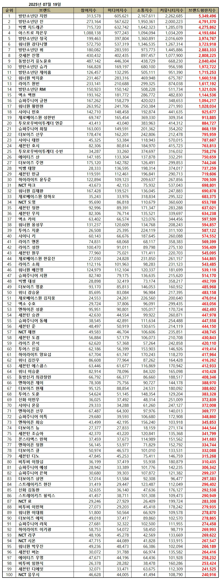 2025년 7월 보이그룹 개인 브랜드평판 100위 브랜드는 방탄소년단 지민, 방탄소년단 진, 빅뱅 지드래곤, 아스트로 차은우, 방탄소년단 정국, 워너원 강다니엘, 방탄소년단 뷔, 갓세븐 진영, 동방신기 유노윤호, 방탄소년단 슈가, 방탄소년단 제이홉, 워너원 박지훈, 라이즈 원빈, 방탄소년단 RM, 엑소 백현, 슈퍼주니어 규현, 워너원 황민현, 샤이니 민호, 제로베이스원 성한빈, 투모로우바이투게더 연준, 슈퍼주니어 희철, 더보이즈 선우, 샤이니 태민, 세븐틴 호시, 투모로우바이투게더 수빈, 에이티즈 산, 더보이즈 주연, 빅뱅 태양, 세븐틴 민규, 하이라이트 윤두준, NCT 마크, 워너원 김재환, 제로베이스원 장하오, NCT 도영, 세븐틴 정한, 세븐틴 우지, 엑소 카이, 워너원 옹성우, 투어스 지훈, 샤이니 키, 라이즈 앤톤, 라이즈 성찬, 세븐틴 원우, 제로베이스원 한유진, 라이즈 소희, 워너원 배진영, 슈퍼주니어 시원, 빅뱅 대성, 더보이즈 영훈, 위너 강승윤, 제로베이스원 김지웅, 엑소 수호, 엔하이픈 성훈, 세븐틴 승관, 슈퍼주니어 동해, 세븐틴 준, NCT 재현, 세븐틴 도겸, 라이즈 은석, 투어스 신유, 하이라이트 양요섭, 위너 김진우, 세븐틴 에스쿱스, 위너 이승훈, 동방신기 최강창민, 엔하이픈 제이, 더보이즈 현재, 투어스 도훈, 신화 이민우, 샤이니 온유, 엔하이픈 선우, 슈퍼주니어 이특, 엔하이픈 희승, 더보이즈 뉴, 세븐틴 조슈아, 몬스타엑스 민혁, 엔하이픈 정원, 더보이즈 큐, 세븐틴 디노, 비투비 이창섭, 슈퍼주니어 예성, 슈퍼주니어 은혁, 더보이즈 상연, 스트레이키즈 현진, 신화 김동완, 스트레이키즈 필릭스, NCT 료, 비투비 이민혁, 워너원 이대휘, 더보이즈 에릭, 슈퍼주니어 려욱, 하이라이트 이기광, NCT 리쿠, NCT 시온, 워너원 박우진, 세븐틴 버논, 에이티즈 우영, 비투비 임현식, 세븐틴 디에잇, NCT 유우시이다.