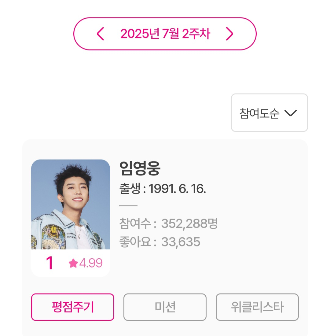 임영웅은 7월 14일부터 7월 20일까지 집계된 7월 2주차 아이돌차트 평점랭킹에서 35만 2288표를 얻어 1위를 차지했다.