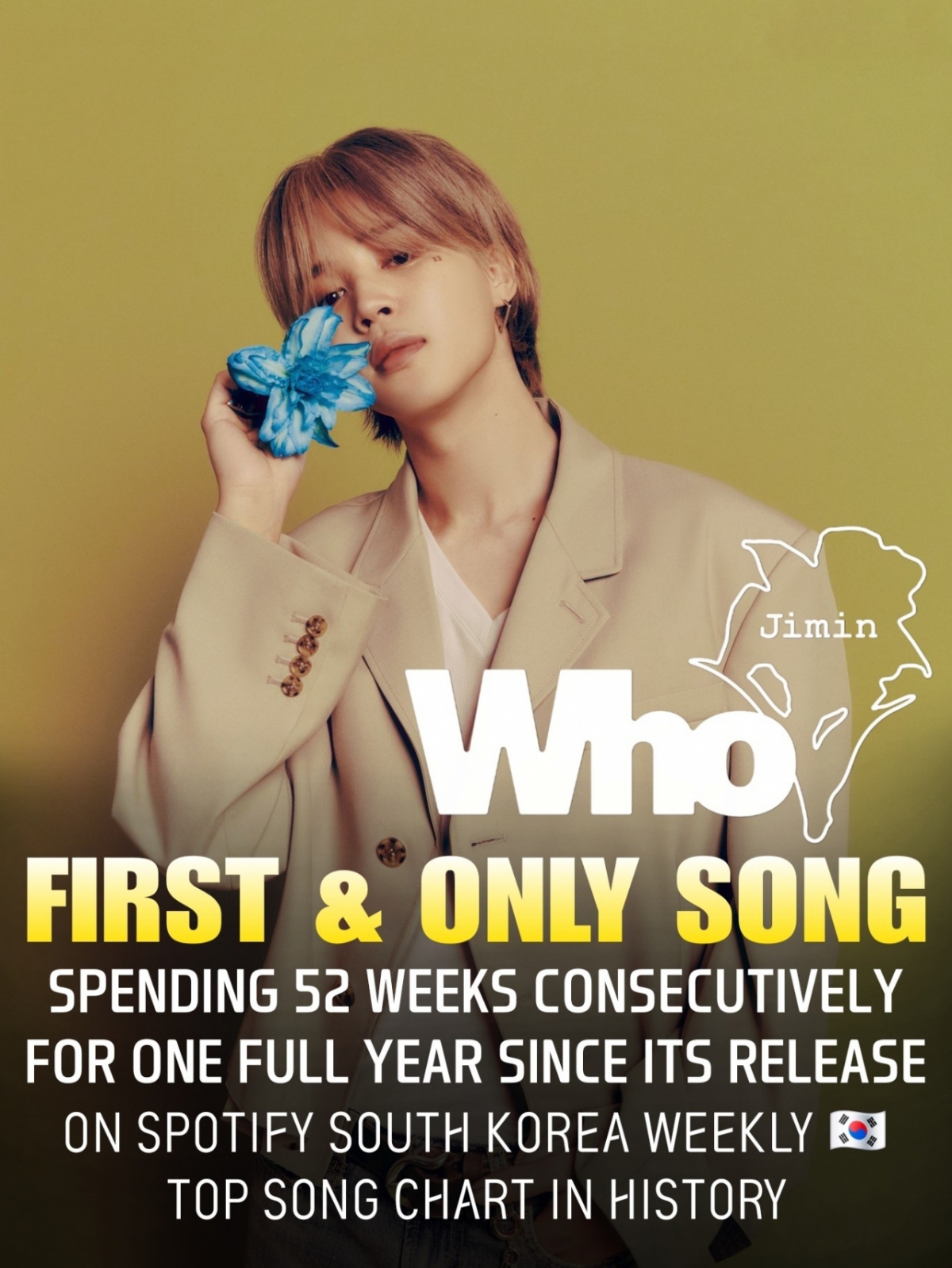 세계 최대 음원 플랫폼 스포티파이의 7월 17일자 차트 업데이트에 따르면, 지민의 2집 솔로앨범 'MUSE'(뮤즈) 타이틀곡 'Who'(후)는 스포티파이 한국 '위클리 톱 송' 차트에서 연속 52주 정상에 올랐다.