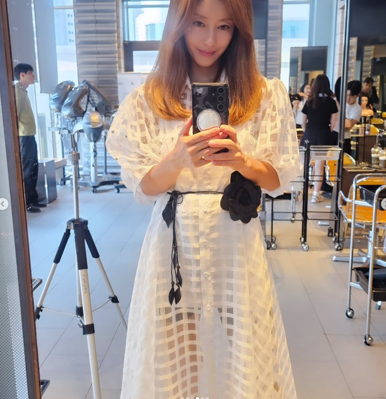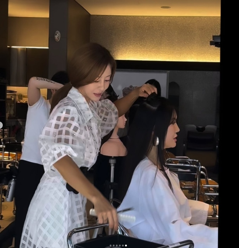 사진 속 이지현은 자신의 미용실에 방문한 방송인 장영란의 머리를 손질하는 모습이었다.