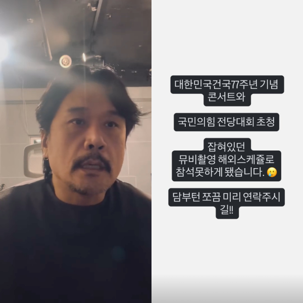 가수 JK김동욱이 국민의힘 전당대회 축하 무대에 초청됐지만 예정된 해외 스케줄로 인해 불발됐다고 직접 언급했다.