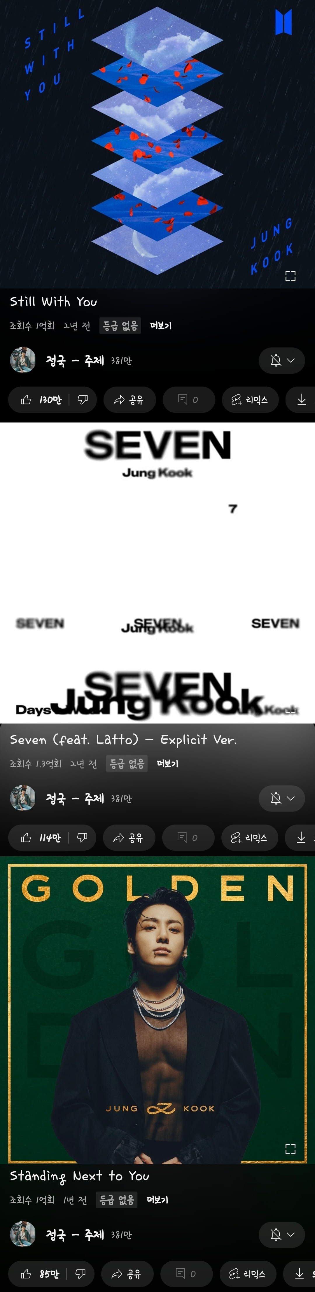정국의 유튜브 공식 토픽에 오른 오디오 영상 중 'Seven' 익스플리시트 버전은 1억 3900만, 'Standing Next to You'는 1억, 'Dreamers'(드리머스)는 9300만, 'Seven' 클린 버전(Clean Ver.)은 9000만, 'Yes or No'(예스 오아 노)는 7200만, 'Please Don't Change'(플리즈 돈트 체인지)는 5300만, 'Too Sad to Dance'(투 세드 투 댄스)는 3100만 등 엄청난 조회수를 나타내고 있다.