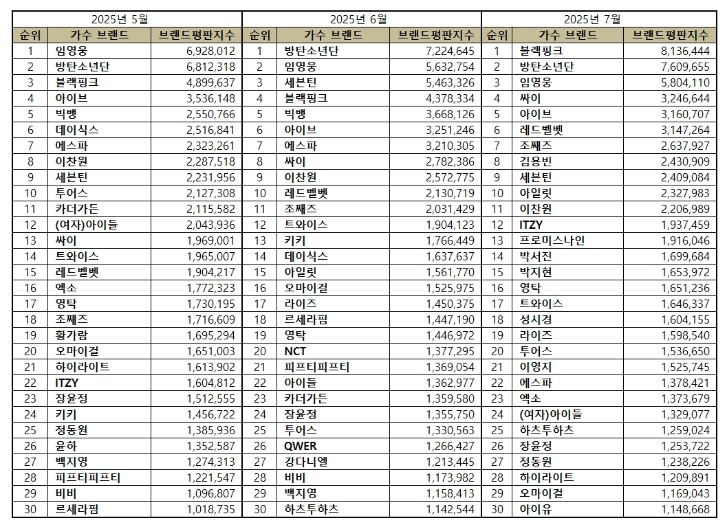 2025년 7월 가수 브랜드평판 30위 순위는 블랙핑크, 방탄소년단, 임영웅, 싸이, 아이브, 레드벨벳, 조째즈, 김용빈, 세븐틴, 아일릿, 이찬원, ITZY, 프로미스나인, 박서진, 박지현, 영탁, 트와이스, 성시경, 라이즈, 투어스, 이영지, 에스파, 엑소, (여자)아이들, 하츠투하츠, 장윤정, 정동원, 하이라이트, 오마이걸, 아이유, 베이비몬스터 순으로 분석됐다.