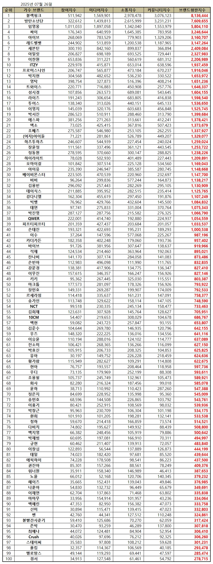 한국기업평판연구소는 2025년 6월 26일부터 2025년 7월 26일까지의 가수 브랜드 빅데이터 115,695,094개를 분석하여 소비자들의 브랜드 참여, 미디어, 소통, 커뮤니티 분석을 했다. 지난 6월 가수 브랜드 빅데이터 107,258,981개와 비교하면 7.87% 증가했다.
