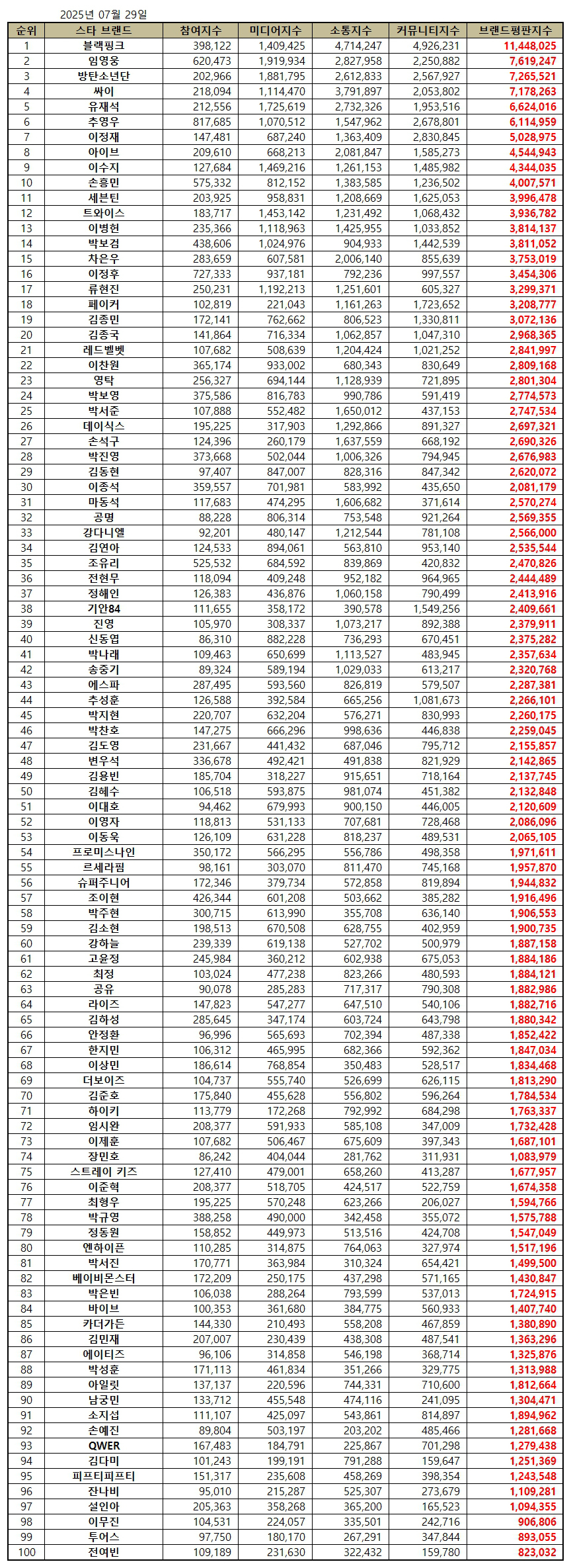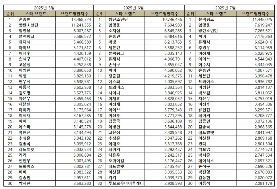 스타 브랜드평판 2025년 7월 빅데이터 분석 100위는 블랙핑크, 임영웅, 방탄소년단, 싸이, 유재석, 추영우, 이정재, 아이브, 이수지, 손흥민, 세븐틴, 트와이스, 이병헌, 박보검, 차은우, 이정후, 류현진, 페이커, 김종민, 김종국, 레드벨벳, 이찬원, 영탁, 박보영, 박서준, 데이식스, 손석구, 박진영, 김동현, 이종석, 마동석, 공명, 강다니엘, 김연아, 조유리, 전현무, 정해인, 기안84, 진영, 신동엽, 박나래, 송중기, 에스파, 추성훈, 박지현, 박찬호, 김도영, 변우석, 김용빈, 김혜수, 이대호, 이영자, 이동욱, 프로미스나인, 르세라핌, 슈퍼주니어, 조이현, 박주현, 김소현, 강하늘, 고윤정, 최정, 공유, 라이즈, 김하성, 안정환, 한지민, 이상민, 더보이즈, 김준호, 하이키, 임시완, 이제훈, 장민호, 스트레이 키즈, 이준혁, 최형우, 박규영, 정동원, 엔하이픈, 박서진, 베이비몬스터, 박은빈, 바이브, 카더가든, 김민재, 에이티즈, 박성훈, 아일릿, 남궁민, 소지섭, 손예진, QWER, 김다미, 피프티피프티, 잔나비, 설인아, 이무진, 투어스, 전여빈 순으로 분석됐다.