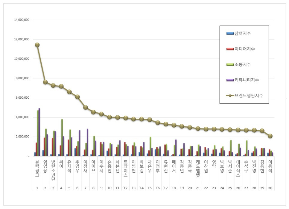 2025년 7월 스타 브랜드평판 30위 순위는 블랙핑크, 임영웅, 방탄소년단, 싸이, 유재석, 추영우, 이정재, 아이브, 이수지, 손흥민, 세븐틴, 트와이스, 이병헌, 박보검, 차은우, 이정후, 류현진, 페이커, 김종민, 김종국, 레드벨벳, 이찬원, 영탁, 박보영, 박서준, 데이식스, 손석구, 박진영, 김동현, 이종석 순으로 분석됐다.