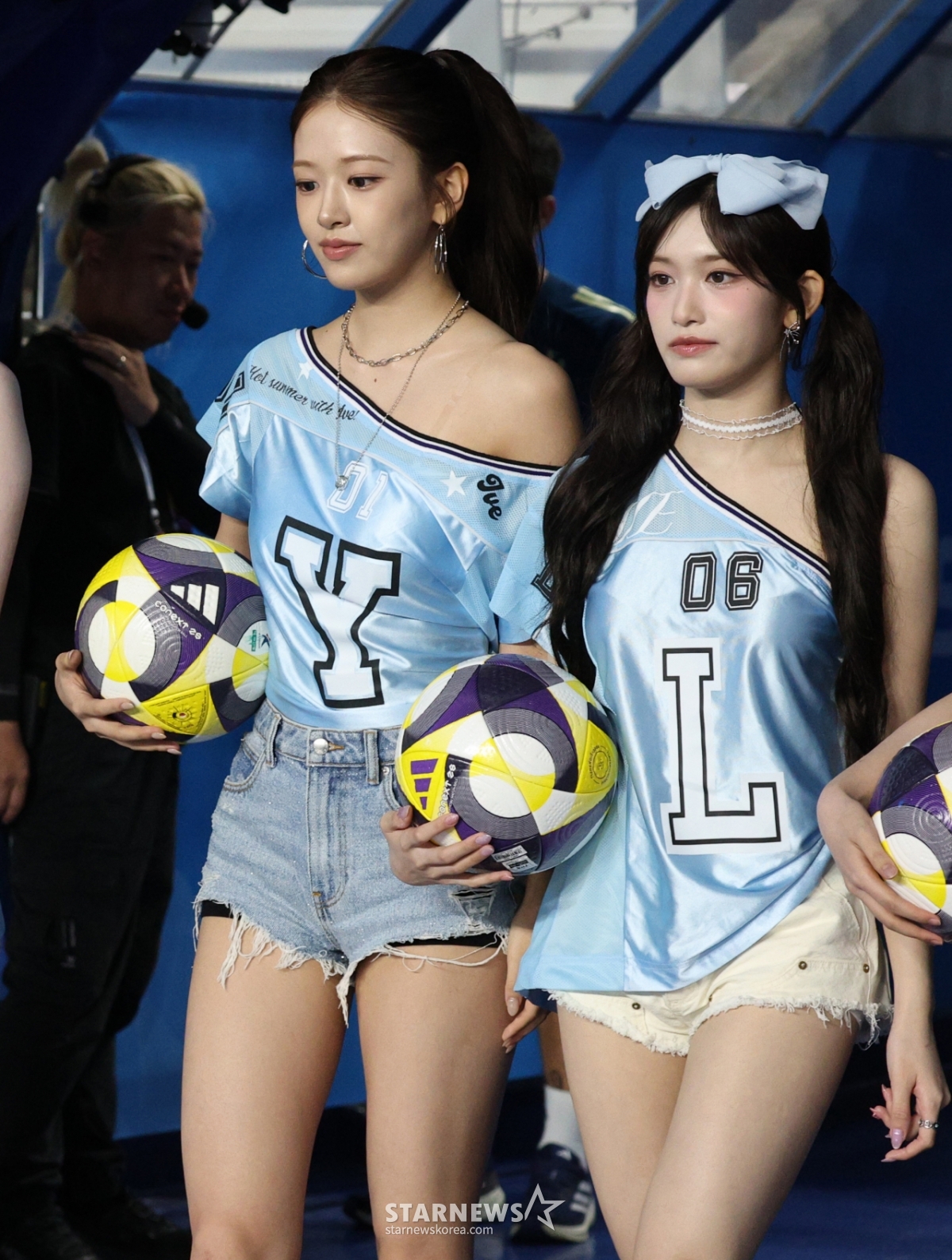그룹 아이브(IVE-안유진, 레이, 가을, 장원영, 라즈, 이서) 맴버들이 시축을 위해 입장하고 있다.
