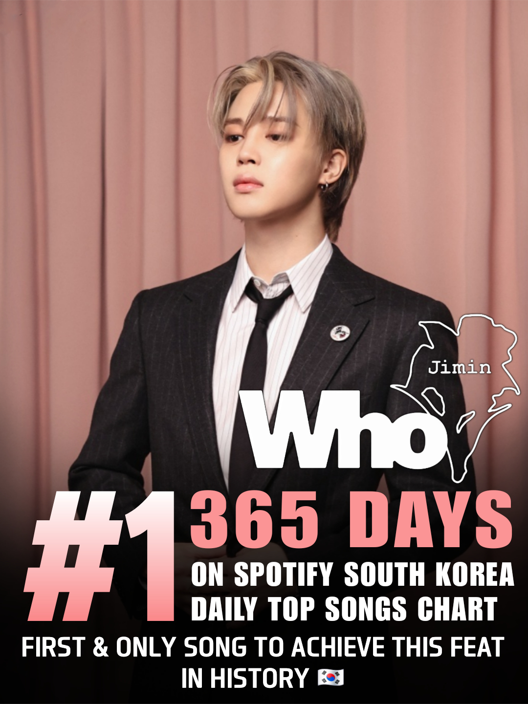 세계 최대 음원 플랫폼 스포티파이의 7월 29일자 차트 업데이트에 따르면, 지민의 2집 솔로앨범 'MUSE'(뮤즈) 타이틀곡 'Who'(후)는 스포티파이 한국 '데일리 톱 송' 차트에서 365일째 1위에 올랐다.
