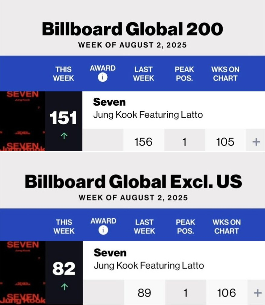 'Seven'은 8월 2일 자 '글로벌(미국 제외)'에서도 82위에 이름을 올리면서 빌보드 주요 두 차트에 차트인하며 글로벌 메가 히트송의 인기 고공 행진을 이어가고 있다.