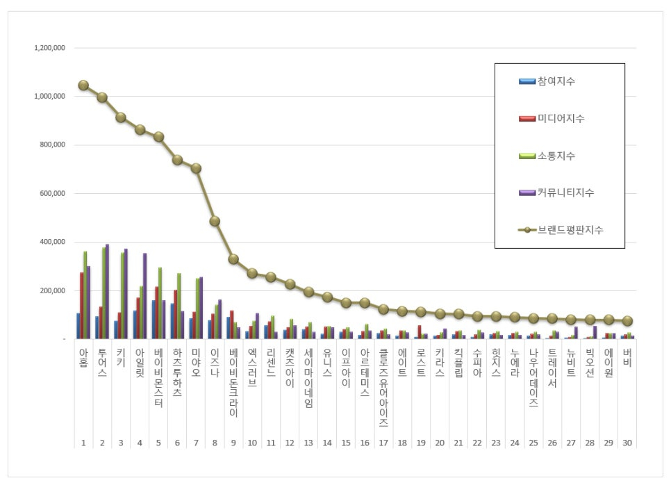 4위, 아일릿 ( 윤아, 민주, 모카, 원희, 이로하 ) 브랜드는 참여지수 118,090 미디어지수 171,512 소통지수 219,132 커뮤니티지수 354,581이 되면서 브랜드평판지수 863,314로 분석됐다. 지난 7월 브랜드평판지수 949,872와 비교해보면 9.11% 하락했다.