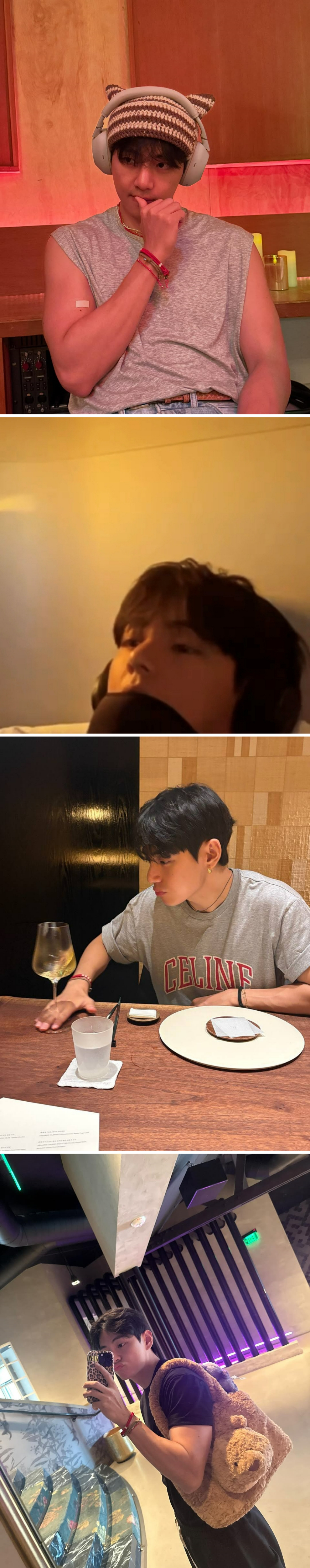 뷔는 4일 인스타그램에 "엉망진창 근황, 심심해하는 아미에게 전하기"라는 글과 함께 여러 장의 사진을 게재했다.