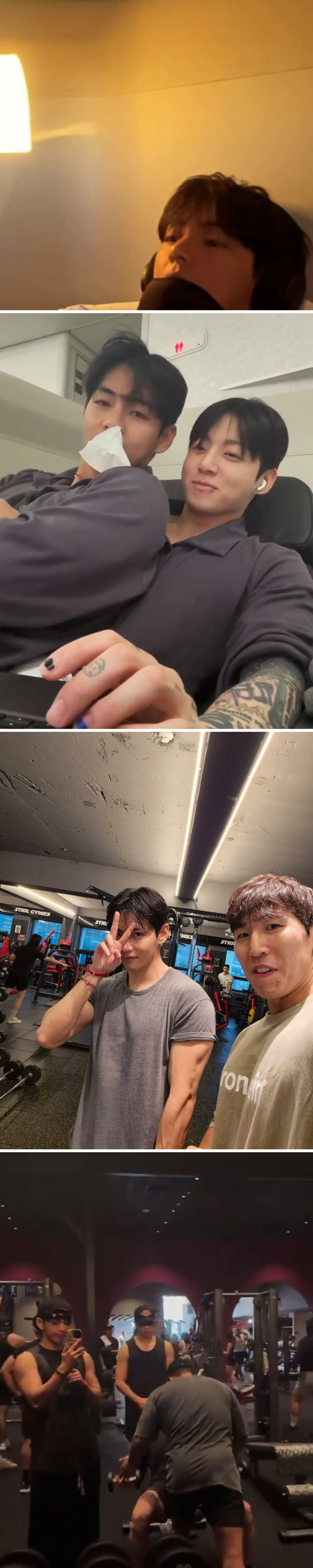 운동을 하는 근황도 빼놓지 않았다. 코카콜라 제로 앰배서더답게 빨간색 코카콜라 모자를 쓰고 운동하는 사진에서는 민소매를 입은 탄탄한 팔근육이 시선을 사로잡았다. 뷔는 미국에서 같이 운동하는 운동팸인 RM, 정국과 함께 한 모습도 팬들에게 공개해 반가움을 안겼다.