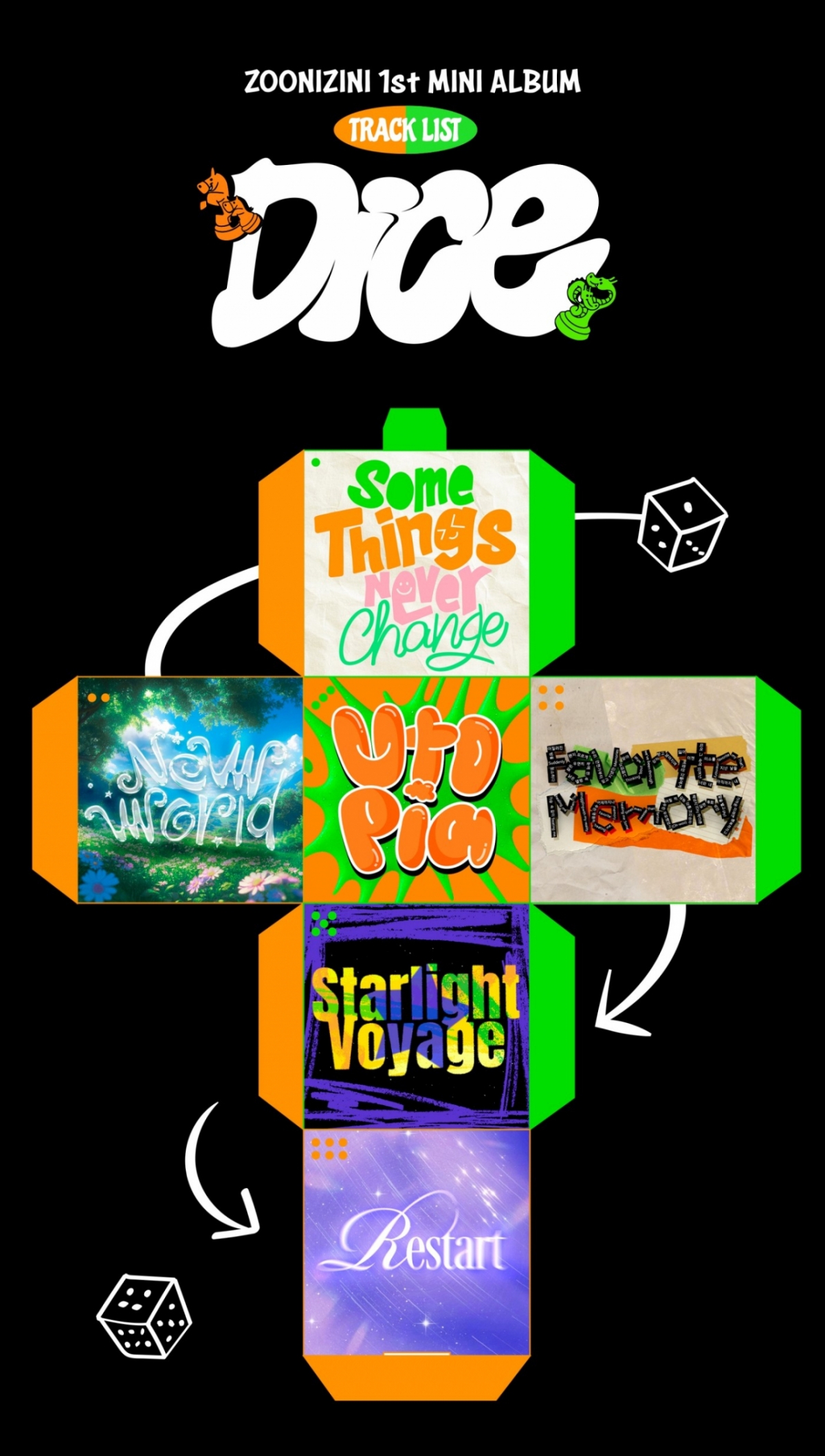 이미지 속 평면으로 펼쳐진 주사위의 여섯 면에 주니지니의 이번 미니 1집 '다이스'에 수록되는 총 6곡의 트랙명이 각각 담겼다. 타이틀곡이자 1번 트랙인 '썸 띵스 네버 체인지'를 시작으로 '뉴 월드(New world)', '유토피아(Utopia)', '페이버릿 메모리(Favorite Memory)', '스타라이트 보이지(Starlight Voyage)', '리스타트(Restart)'까지 다채로운 곡명이 컬러풀한 폰트로 드러났다.