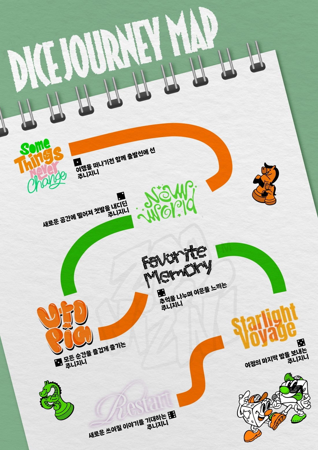 또 다른 이미지에서는 트랙들을 하나의 스토리라인으로 이어지는 여행기로 표현해 '다이스'의 짜임새 있는 구성을 예고하고 있다. 출발선을 지나 새로운 공간에 첫발을 내디디고, 추억과 여운을 함께하며 새로 쓰일 이야기를 기대하기까지 주니지니의 특별한 우정 여행을 '다이스'에서 만날 전망이다.
