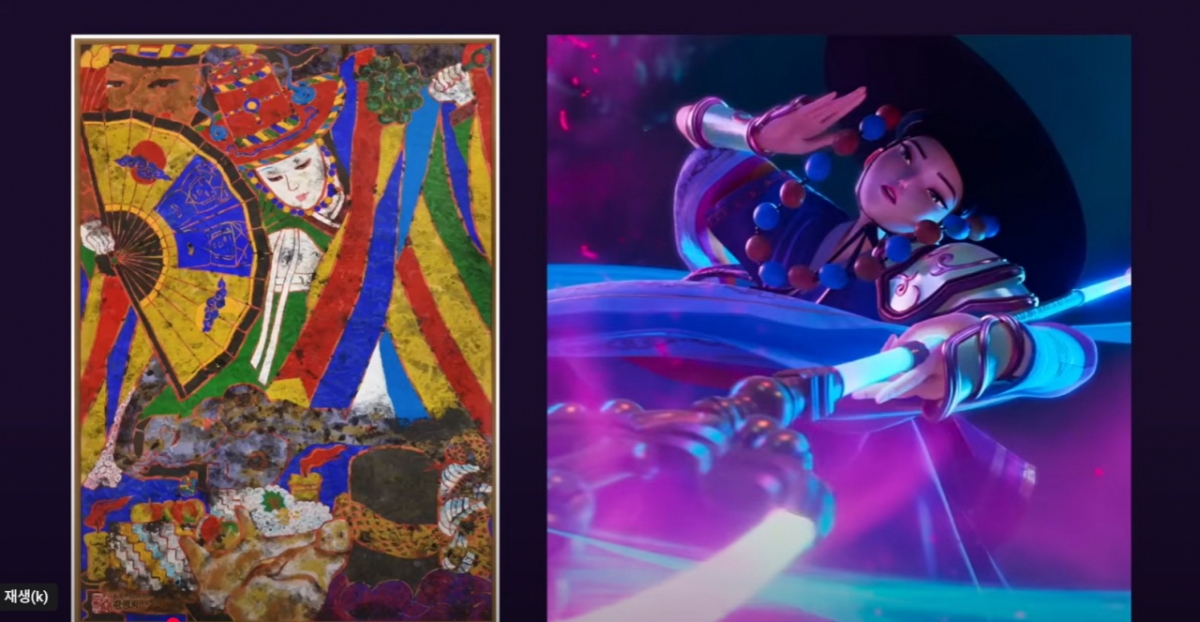 또 18세기 검무(劍舞)를 그린 '쌍검대무도(Dancing Together with Two Swords)'와 영화 속 첫 번째 데몬 헌터들의 모습을 비교하며 "660년경부터 시작된 전통 무예 검무(geommu)와 군모인 전립까지 세밀하게 고증됐다"고 설명했다.
