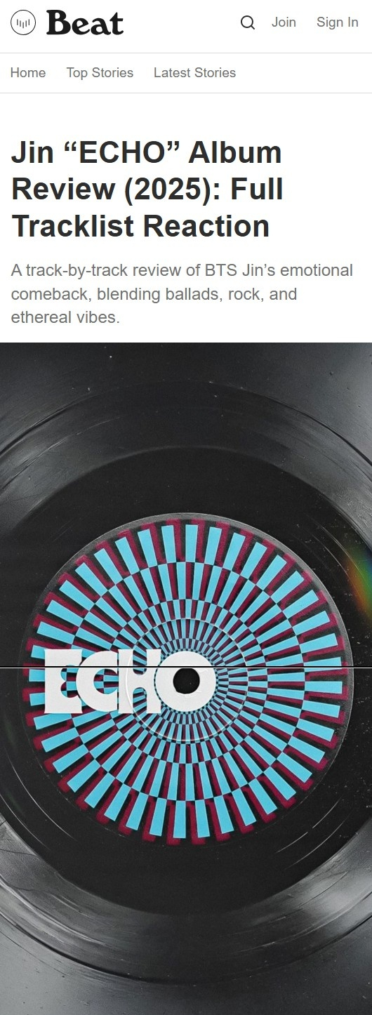리뷰를 작성한 이는 '스푸키 마이크로 챌린지(Spooky micro challenges)' 준우승 경력이 있는 필자로, "세금 신고와 바쁜 일상, 허공을 향해 울어버리는 순간들 속에서 리뷰를 멈추고 있었지만, 진이 'ECHO'를 외치는 순간 돌아왔다"며 글을 시작했다. 그는 "'ECHO'는 단순히 문을 두드리는 수준이 아니라 문을 박차고 들어와 일기장을 건네며 느끼게 한 작품"이라며, 이번 앨범이 청자의 내면 깊숙이 스며드는 몰입감과 감정적 파급력을 지녔다고 평가했다.