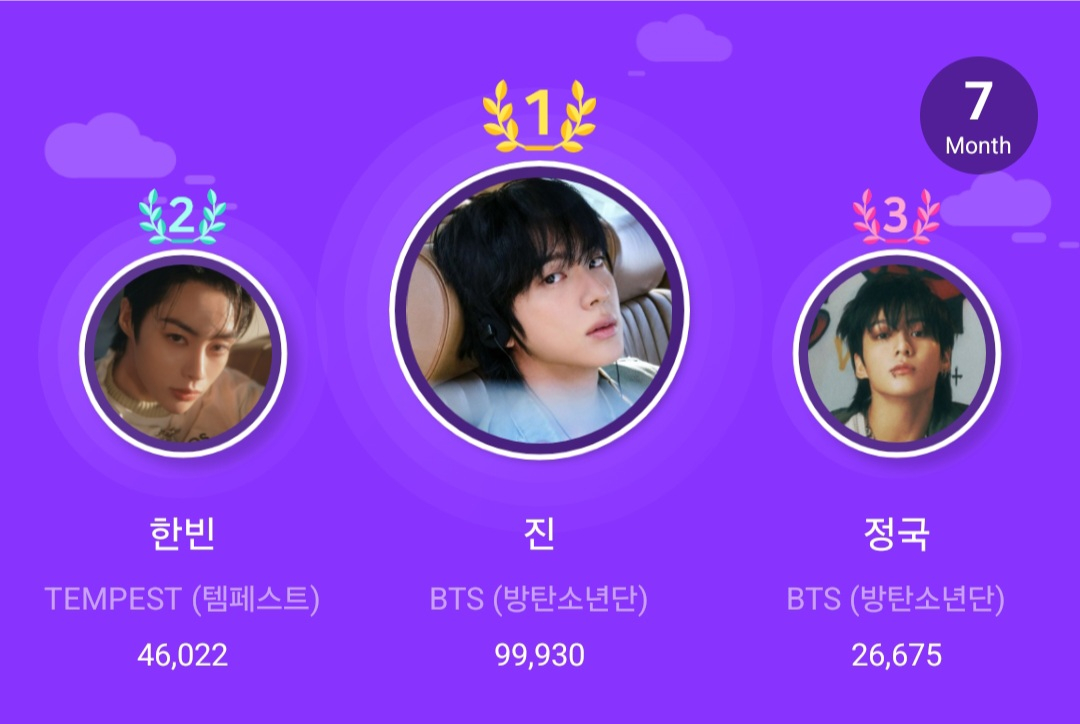 진은 지난 7월 1일부터 15일까지 글로벌 팬덤 플랫폼 스타 플래닛(STAR PLANET)에서 진행한 7월 아이돌 랭킹에서 9만 9930표를 얻으며 압도적인 표수로 1위에 올랐다.