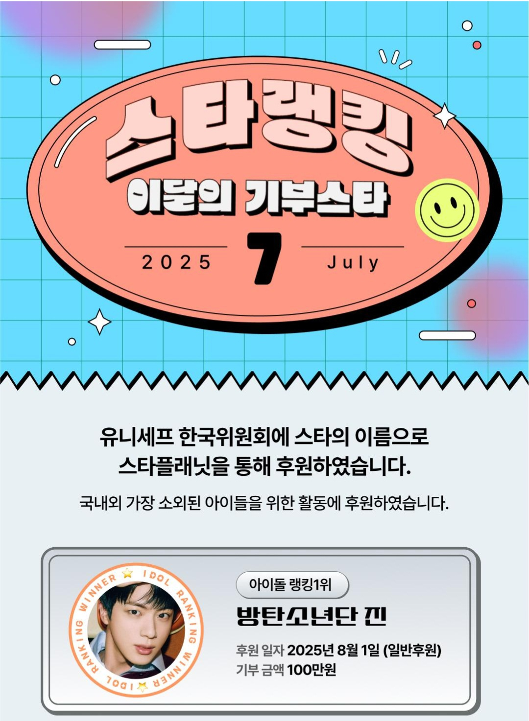 스타 플래닛은 7월 아이돌 랭킹 1위를 차지한 진의 이름으로 8월 1일 유니세프 한국위원회에 100만 원의 기부금을 전달했다고 밝혔다.