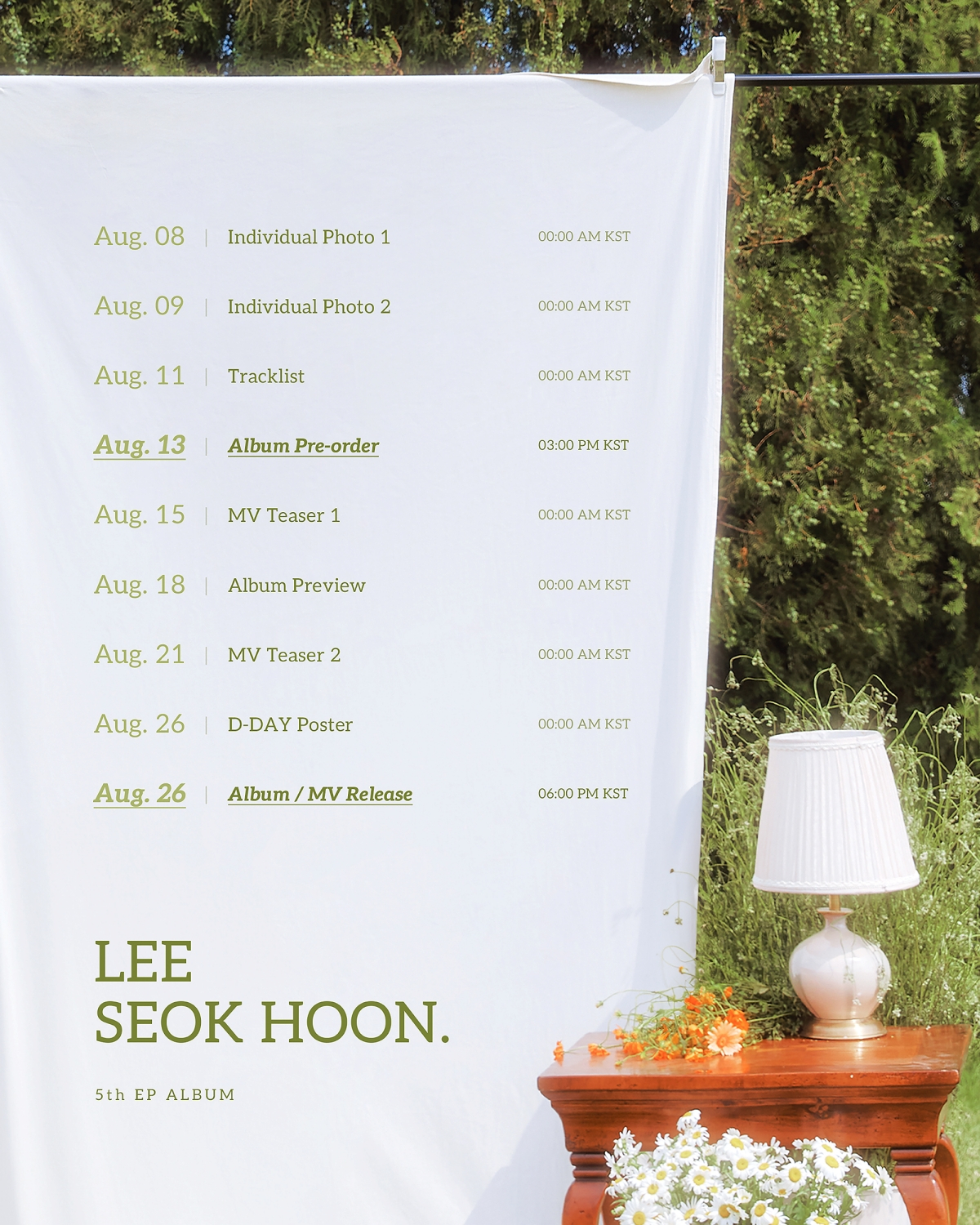 타임테이블에 따르면 이석훈은 26일 컴백 전까지 두 가지 버전의 개인 포토를 시작으로 트랙리스트, 뮤직비디오 티저 두 편, 앨범 프리뷰 등 티징 콘텐츠를 차례로 공개한다. 13일 오후 3시부터는 각종 온라인 판매처를 통해 미니 5집 피지컬 앨범에 대한 예약 판매를 시작한다.