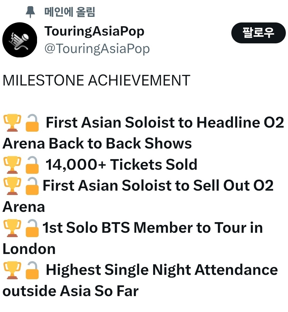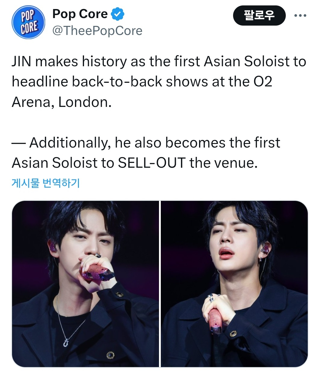 Pop Core 공식 계정은 진이 런던 O2 아레나에서 연속으로 공연을 펼친 최초의 아시아 솔로로 역사를 썼으며, 더불어 진은 O2 아레나를 매진시킨 최초의 아시아 솔로라고 밝혔다.