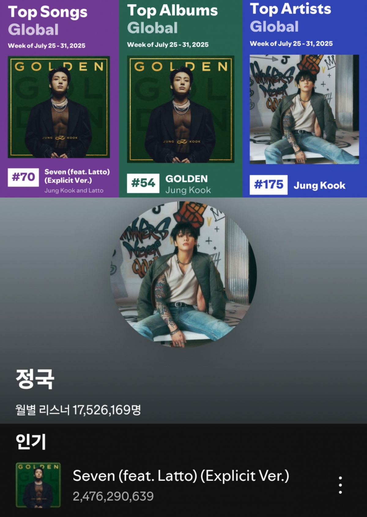 정국은 7월 25일~31일 자 스포티파이 '위클리 톱 아티스트 글로벌' 차트에 175위로 랭크, 통산 113주 동안 이름을 올렸다.