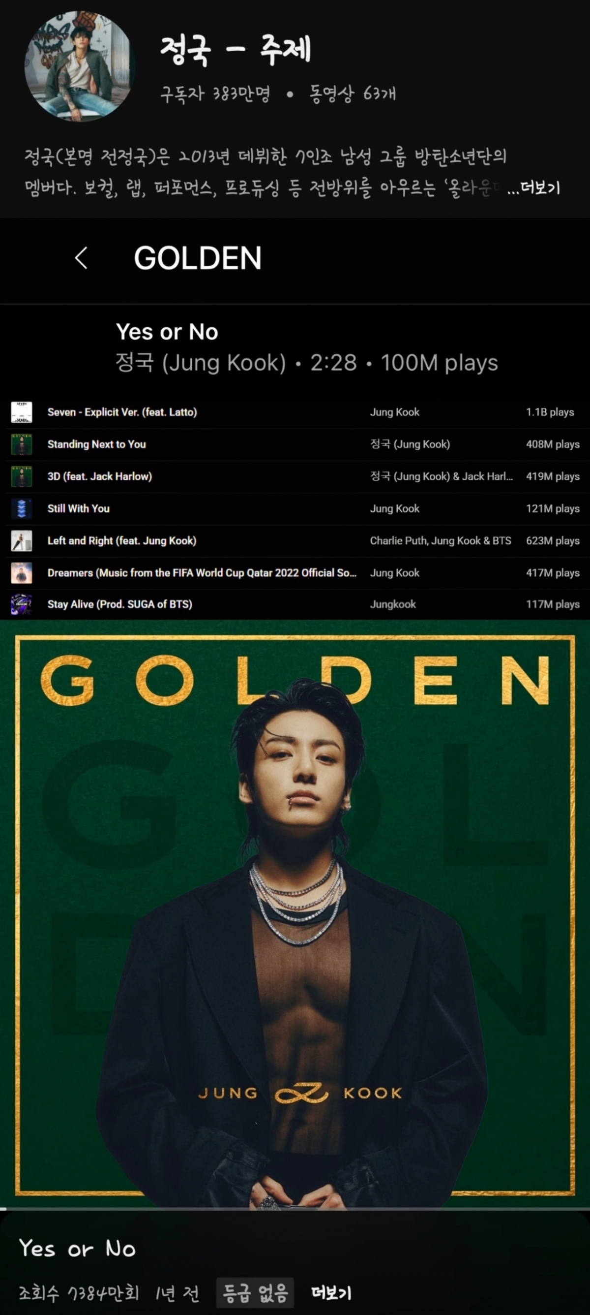 정국의 솔로곡이자 솔로 앨범 'GOLDEN'(골든) 수록곡 'Yes or No'(예스 오아 노)는 최근 유튜브 뮤직에서 1억 플레이(스트리밍)를 돌파했다.