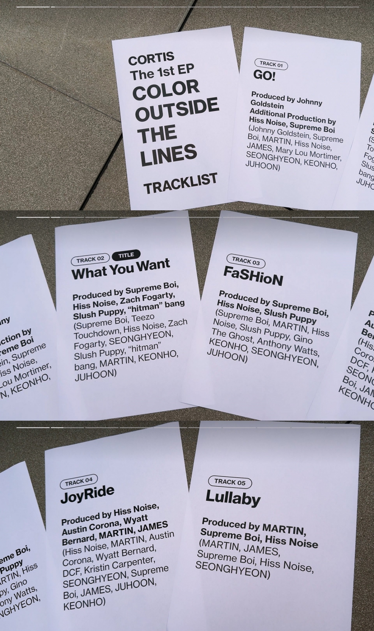 코르티스(마틴, 제임스, 주훈, 성현, 건호)는 10일 하이브 레이블즈 유튜브 채널에서 진행 중인 24시간 프리미어를 통해 데뷔 앨범 'COLOR OUTSIDE THE LINES' 트랙리스트를 공개했다.