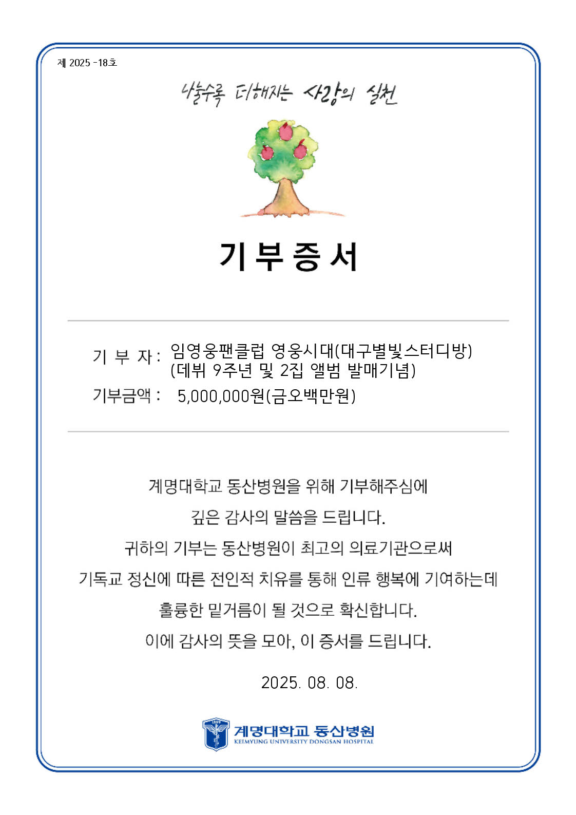 계명대학교 동산병원 사회복지팀은 "임영웅 팬클럽 영웅시대 대구별빛스터디방이 기부금 500만원을 기부하여 주심에 너무나 큰 영광"이라며 "임영웅과 임영웅 팬클럽 모두가 항상 건강하시길 바라며 사랑, 나눔의 실천에 감사드린다"고 전했다.