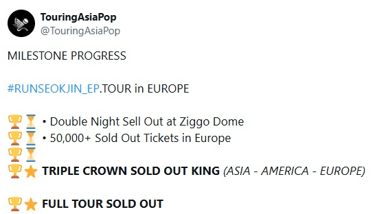 Touring Asia Pop 공식 계정은 또 진이 지고돔에서 한국 솔로 아티스트 역대 최다 관객 및 최다 티켓 판매 기록을 달성했으며 방탄소년단 멤버 중 유일하게 유럽 투어를 진행한 멤버라고 전했다.