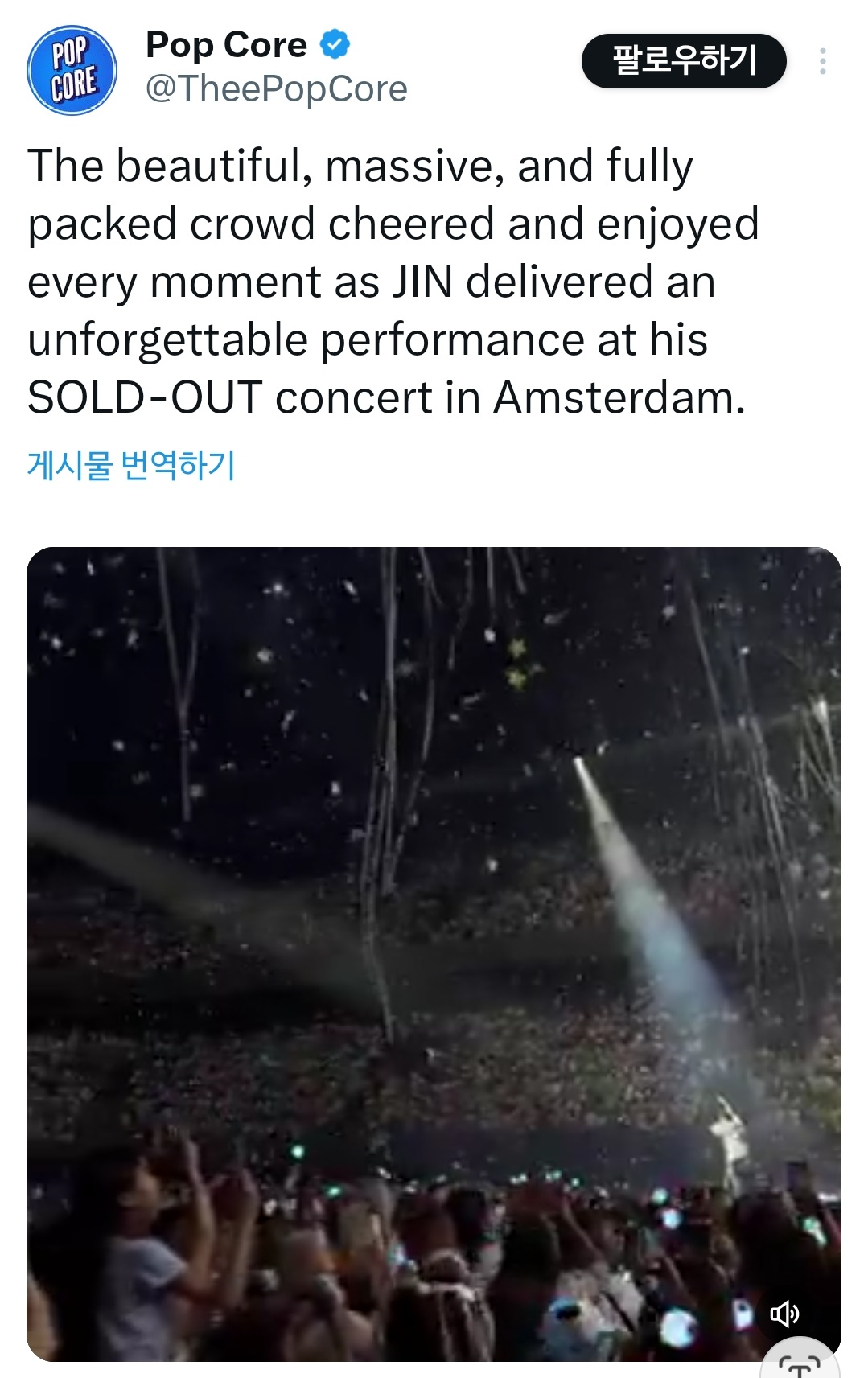 Pop Core 공식 계정은 거대하게 꽉 찬 관중들이 매 순간 환호하며 즐거운 시간을 보냈다며 진이 매진된 암스테르담 콘서트에서 잊을 수 없는 공연을 선보였다고 전했다.