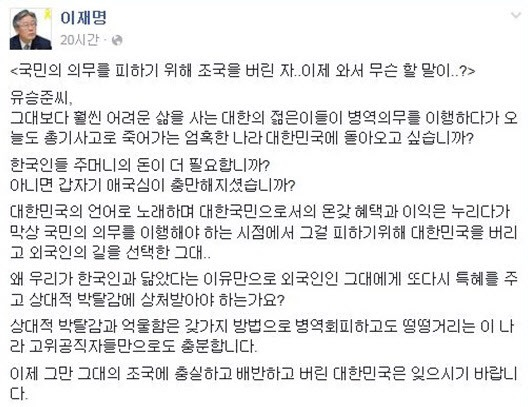또한 "왜 우리가 한국인과 닮았다는 이유만으로 외국인인 그대에게 또다시 특혜를 주고 상대적 박탈감에 상처받아야 하는가요?"라며 "상대적 박탈감과 억울함은 갖가지 방법으로 병역회피하고도 떵떵거리는 이 나라 고위공직자들만으로도 충분합니다. 이제 그만 그대의 조국에 충실하고 배반하고 버린 대한민국은 잊으시기 바랍니다"라고 덧붙였다.