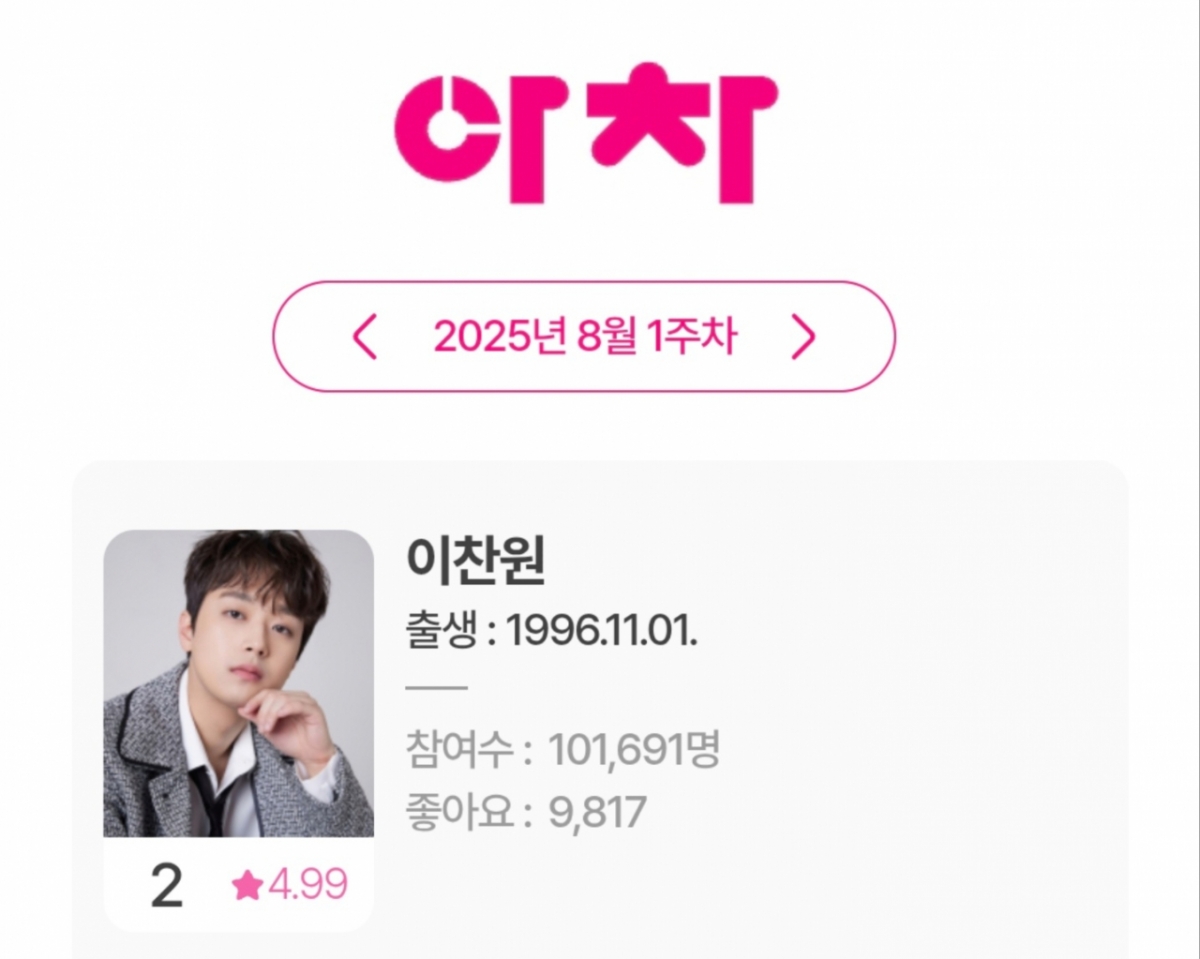 이찬원은 2025년 8월 1주 차 아이돌차트 평점랭킹에서 10만 1691표를 획득, 전체 2위를 차지했다.