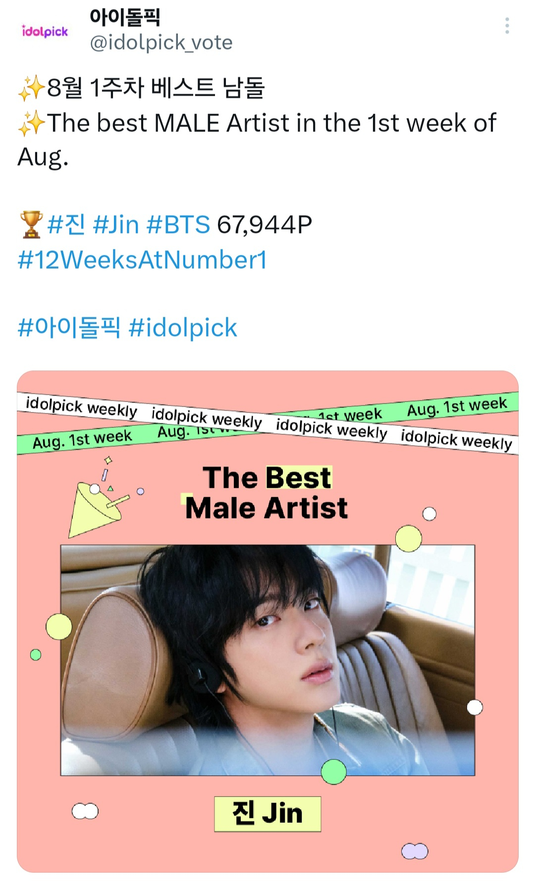 방탄소년단(BTS) 진이 아이돌픽(idolpick) 위클리 투표에서 최다 득표로 1위에 오르며 인기를 빛냈다.