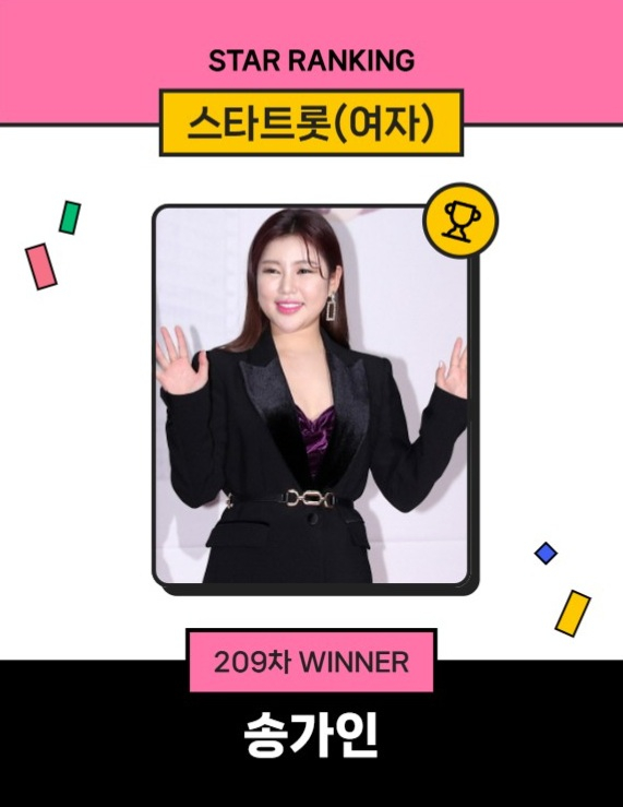 송가인은 7일 오후 3시 1분부터 14일 오후 3시까지 진행된 8월 2주(209차) 스타랭킹 스타트롯 여자 랭킹 투표에서 7만 2468표를 차지해 1위를 기록했다. 그는 209주 연속 왕좌에 오르며 '트롯 여제' 다운 면모를 뽐냈다.
