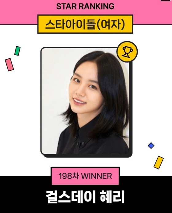 걸그룹 걸스데이 멤버이자 배우 혜리가 스타랭킹 스타아이돌 여자 부문 1위 자리를 유지 중이다.