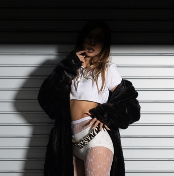 첫 번째 이미지 속 제나 설은 흰색 크롭 피케 티셔츠에 시스루 패턴 스타킹과 하이웨스트 언더웨어를 매치하고, 지브라 무늬 벨트를 포인트로 더했다. 어깨에 걸친 블랙 퍼 코트와 한 손가락을 입가에 댄 포즈는 빛과 그림자가 교차하는 음영 속 강렬한 무드를 완성했다.