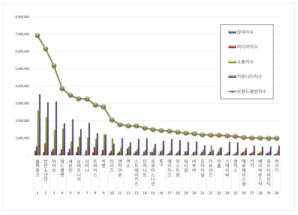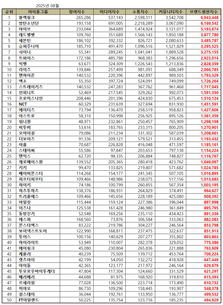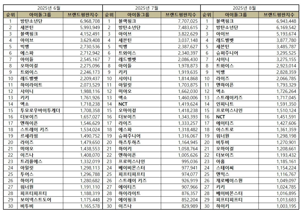 2025년 8월 아이돌그룹 브랜드평판 30위 순위는 블랙핑크, 방탄소년단, 아이브, 레드벨벳, 세븐틴, 슈퍼주니어, 샤이니, 트와이스, 빅뱅, 라이즈, 엔하이픈, 엑소, 스트레이키즈, 인피니트, 프로미스나인, NCT, 에이티즈, 아스트로, 워너원, 비투비, 오마이걸, 더보이즈, 아홉, 스테이씨, 엔믹스, 제로베이스원, 키키, 베이비몬스터, 피프티피프티, 하이키 순으로 분석됐다.